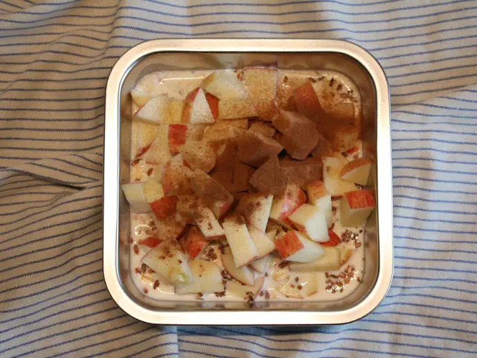 - 113 g Haferflocken und 10 g geschrotete Leinsamen in eine Schüssel geben.